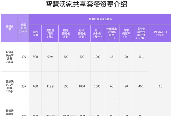以河南为例,“智慧沃家”共享套餐分为169元、236元、296元三种,最低送3GB国内流量、1000分钟通话、20M宽带;最高送6GB全国流量、3000分钟通话、20M宽带。