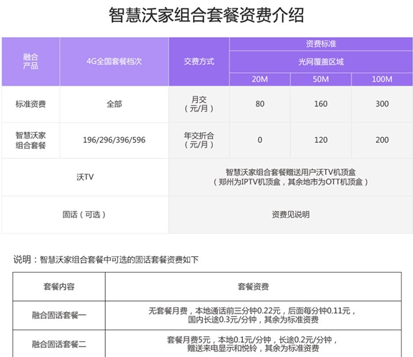 中国联通智慧沃加组合套餐资费介绍: