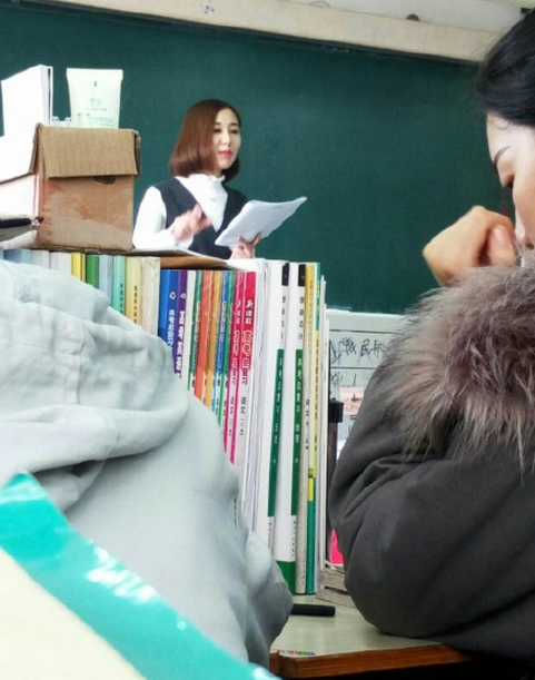 老师的服装有规定的,不能无袖,不能穿超短裤超短裙,要大方得体,这很明显不符合老师的服装打扮,学校允许也是厉害。
