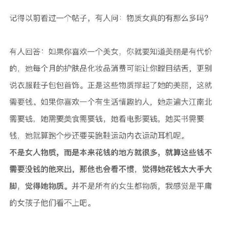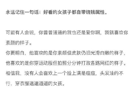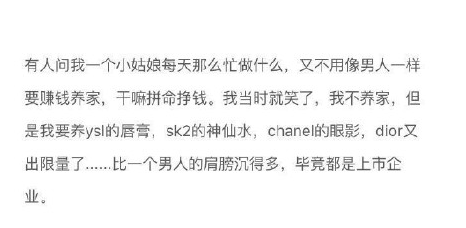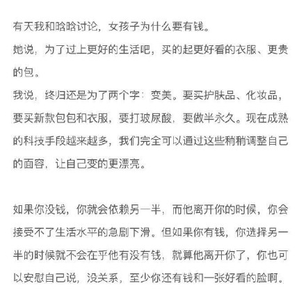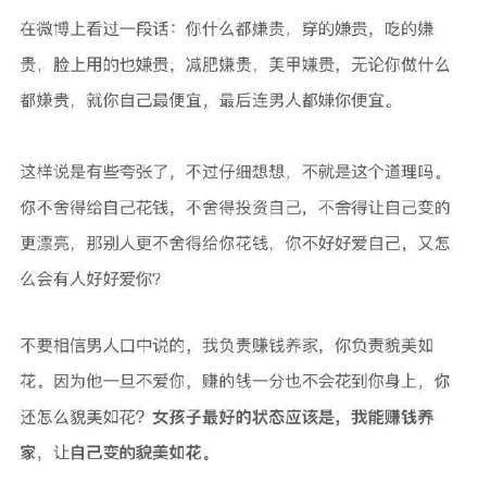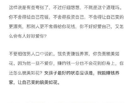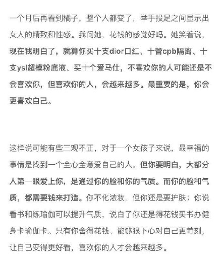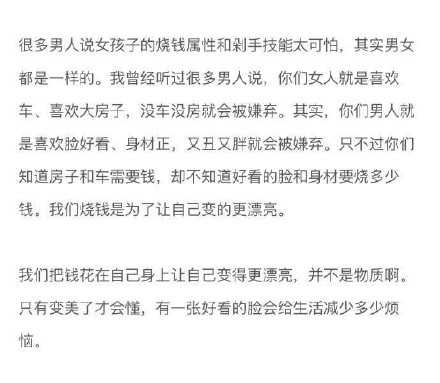 有些时候处于中产阶级是最痛苦的,因为你要知道自己要做的不只是维持生计。因为你还要出门,还要保养自己。所以看到的那些漂亮的女生都自带烧钱属性。