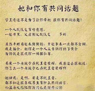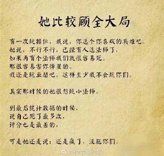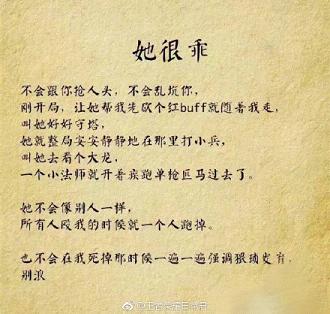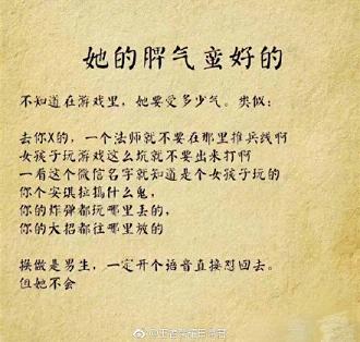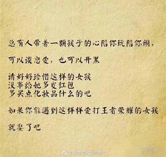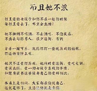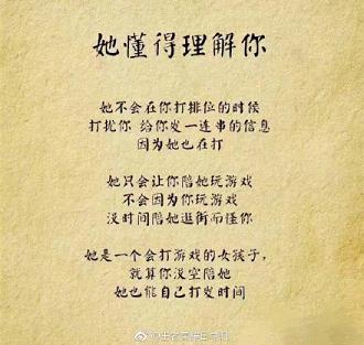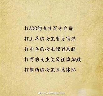 请珍惜身边打王者荣耀的女生,她们不去酒吧,不玩夜店,不出去勾搭男人,很少逛街,省钱。打辅助的女生温柔体贴;打ADC的女生沉着冷静,上单的女生有勇有谋,中单的女生理智果断,打野的女生谨慎细致。关键是她们不在乎自己有多坑,有一种谁欺负了自己,老娘就让他团灭的勇气!Ace~