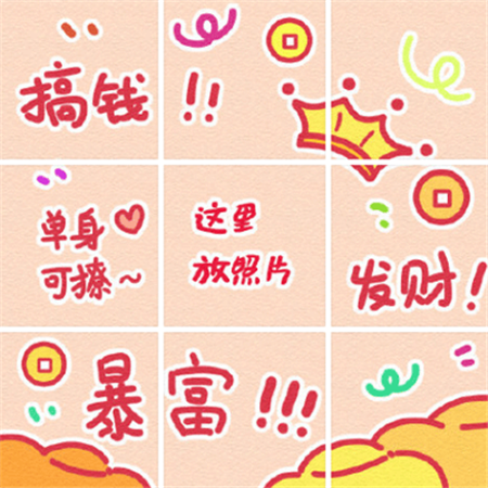 今天给大家分享一组超级有趣又很有创意的单身人士专用朋友圈九宫格配图,一心只想搞钱暴富的你马住吧。