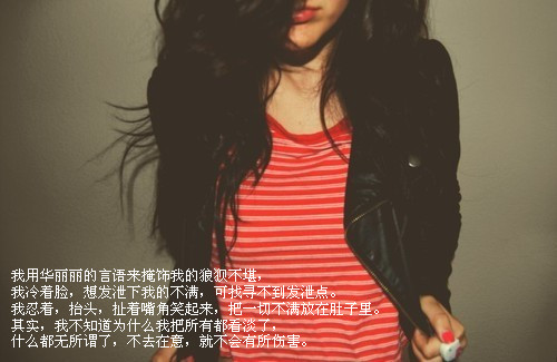 我用华丽丽的言语来掩饰我的狼狈不堪,我冷着脸,想发泄下我的不满,可找寻不到发泄点。我忍着,抬头,扯着嘴角笑起来,把一切不满放在肚子里。其实,我不知道为什么我把所有都看淡了,什么都无所谓了,不去在意,就不会有所伤害。