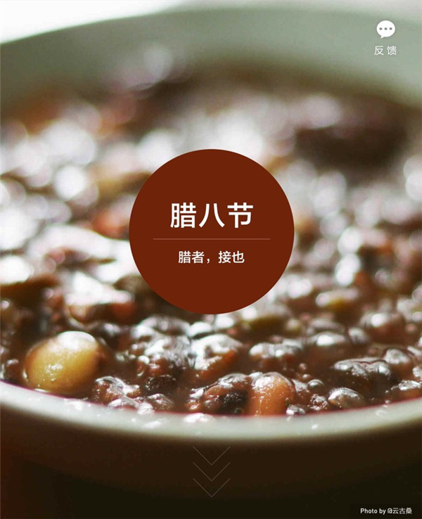 “腊”的含义有三:一曰“腊者,接也”,寓有新旧交替的意思(《隋书・礼仪志》记载);二曰“腊者同猎”,指田猎获取禽兽好祭祖祭神,“腊”从“肉”旁,就是用肉“冬祭”;三曰“腊者,逐疫迎春”。腊八节因腊日而来,是农历腊月最重大的节日,日期为腊月初八,古代称为“腊日”,俗称“腊八节”。