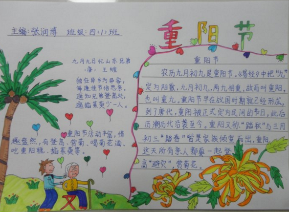 重阳节现在是一个关注老人的节日。重阳节是以娱乐为主的节日,主要节俗活动是登高、赏菊、喝菊花酒、插茱萸、还要吃糕。现在转变为老人节,关爱老人的生活安全。