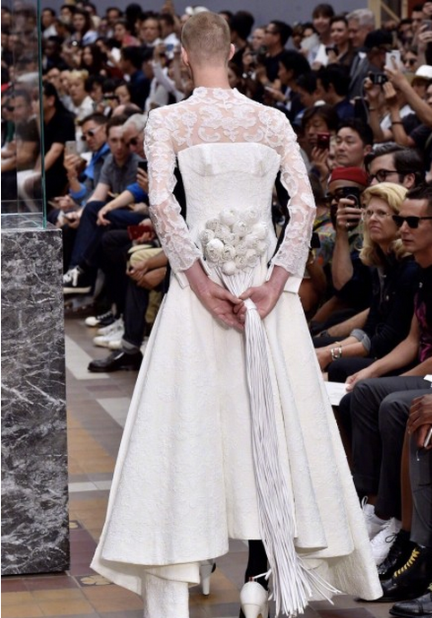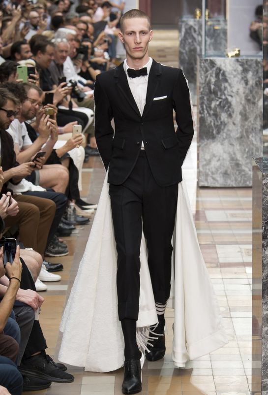 图中造型是刚结束的Thom Browne 2018春夏男装秀上的ending look,这场秀非常有意思,男模特们都踩着高跟走上T台。除了这套的正反“阴阳”,还有上下“阴阳”――上半身西装、下半身裙装,结合起来有种异样的美感。一向走复古禁欲路线的Thom Browne这次可以说是玩嗨了~
