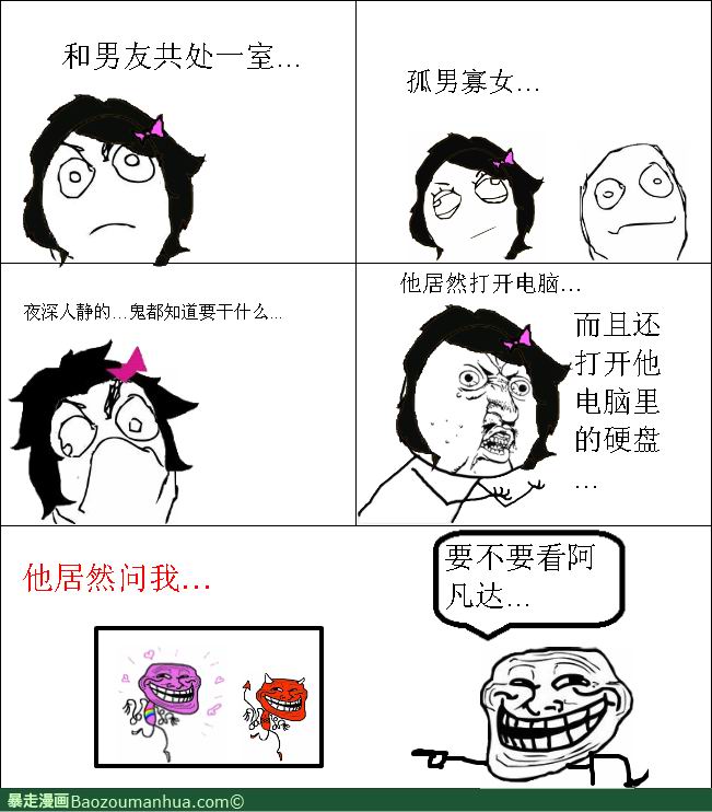 暴走漫画来源于生活中的一些小事,引起很多人的共鸣是因为它所描述的漫画内容会经常的口语化,就是我们典型的生活情况,偶尔的暴一下粗等,描述生活中比较愤怒的事。看到下面的图片,有没有让你想到了邪恶的一面。
