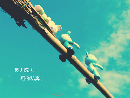 藏在角落被割伤的手指继续将生命的结局亲手写上。 承认不是一种惩罚,只是会精疲力尽。 长大之后,和你一起私奔。 今天不是末日,明天离末日更近。 少年无知,及盲。