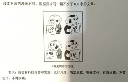 问卷上是一幅漫画,漫画小人拿着考卷在展示,脸上印着唇印、巴掌印。要求考生看图写一篇不少于800字的文章,需结合内容、寓意,自拟标题。