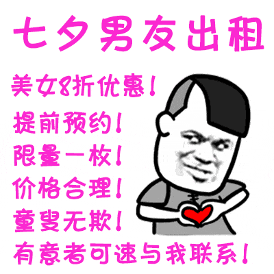 七夕男友出租,美女八折优惠!提前预约。这是今年最流行的七夕男友出租表情包了。还是单身的小伙伴,一定要了解一下。