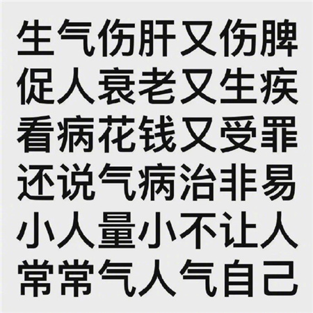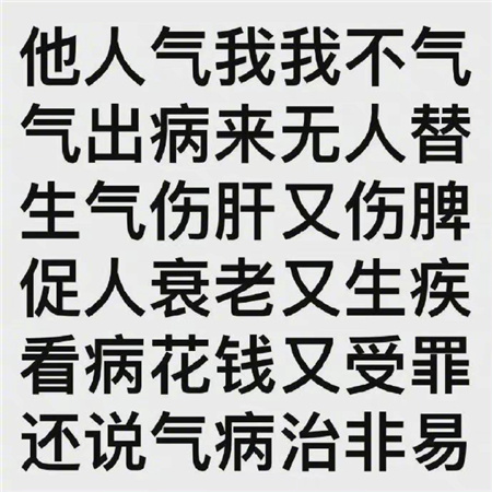 生活中一定要少生一点气呀,对自己一定要好点呀,生气会让很多疾病来找自己,记住不生气不生气。