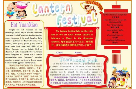 春节之后,就是元宵节,也是一年之中很特别的一个传统节日,是人们团聚在一起吃汤圆是元宵的日子。在元宵节,很多地方都会有各种各样的活动。下面让我们看看元宵节的英语手抄报图片吧!