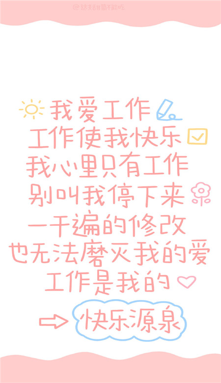 我爱工作,工作使我快乐,我心里只有工作,别叫我停下来,一千遍的修改也无法磨灭我的爱,工作是我的快乐源泉。